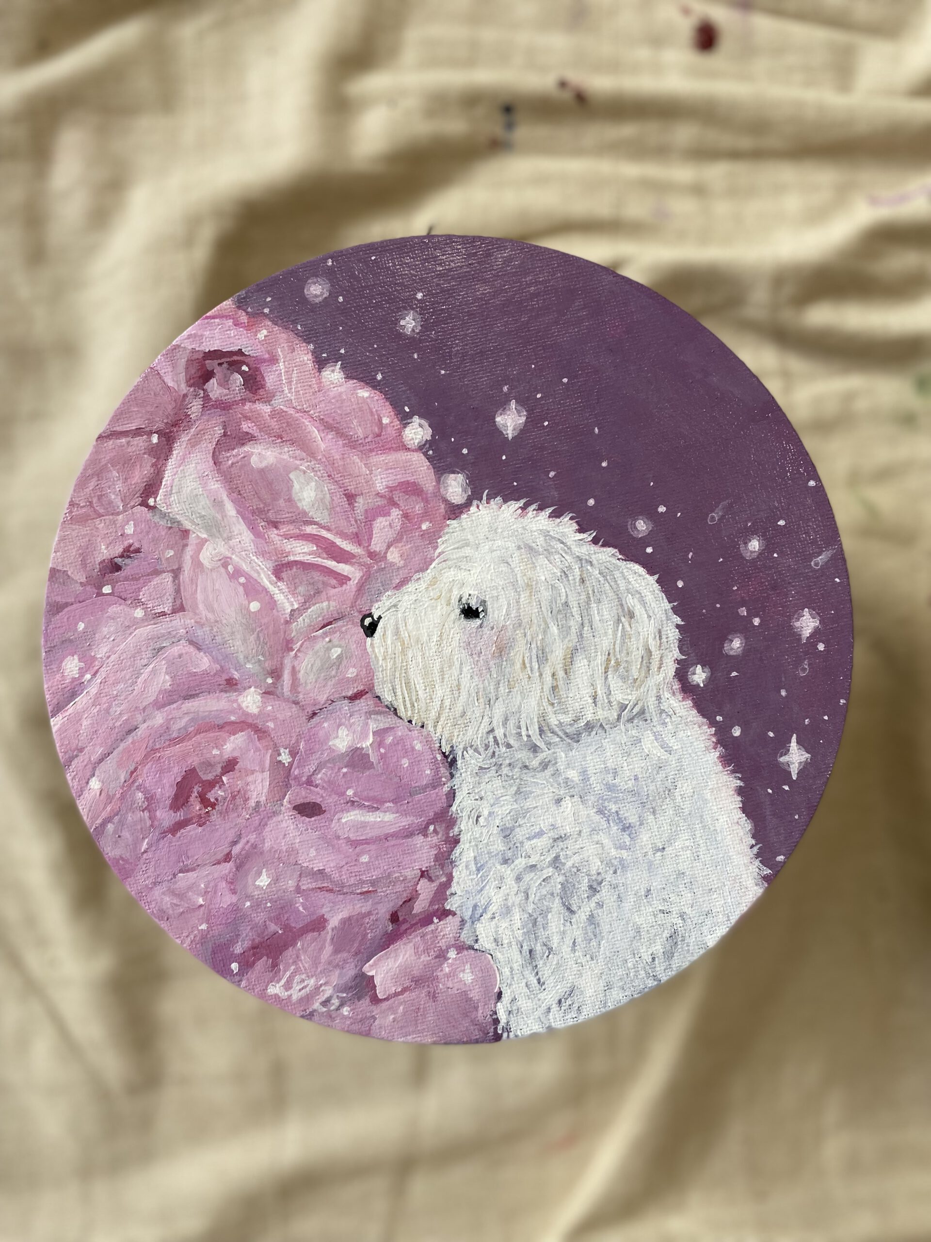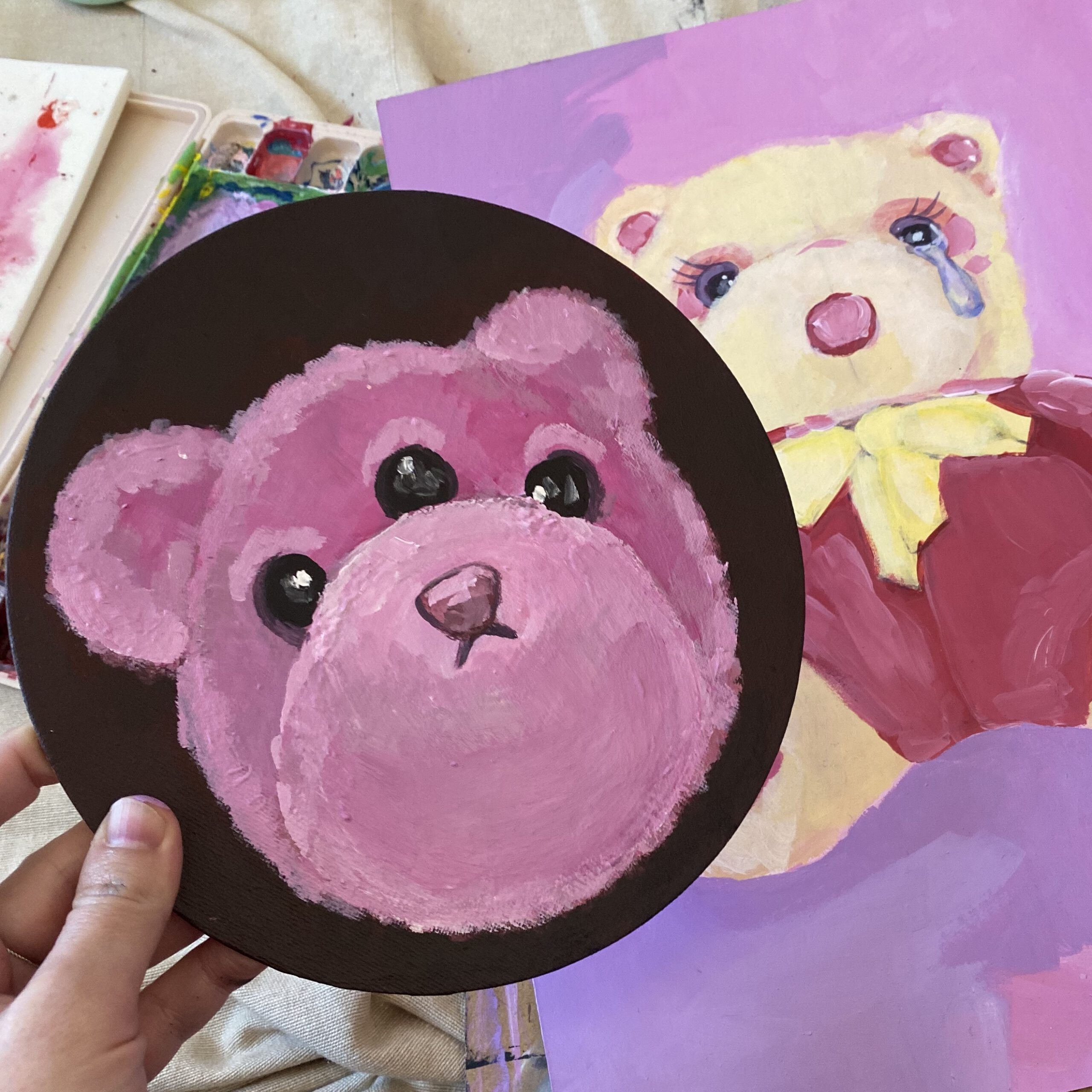 Beispiel: ein Acryl-Portrait eines Teddybären in der Größe 20x20cm (oder auch rund) auf Malpappe mit Baumwolltuch (Canvas Board) kostet etwa 50€